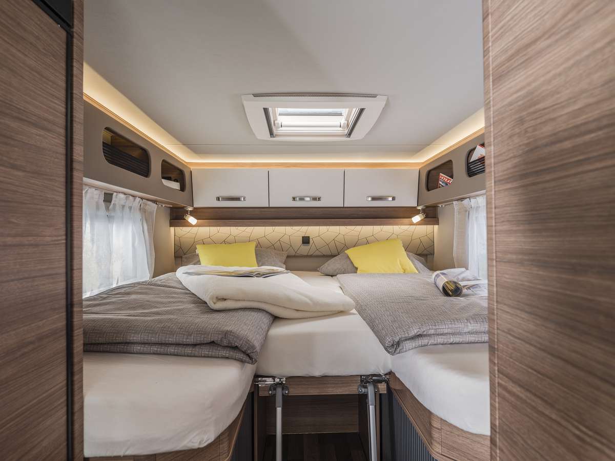 Beide Grundrisse bieten mit ihrem ausgeklügelten Design viel Stauraum. So stehen zahlreiche Oberschränke und im 600 MF zusätzlich ein geräumiger Kleiderschrank zur Verfügung. Noch mehr Platz für Kleidung und weiteres Gepäck kommt unter den Betten und beim 600 MEG in der Bettstufe zum Vorschein.